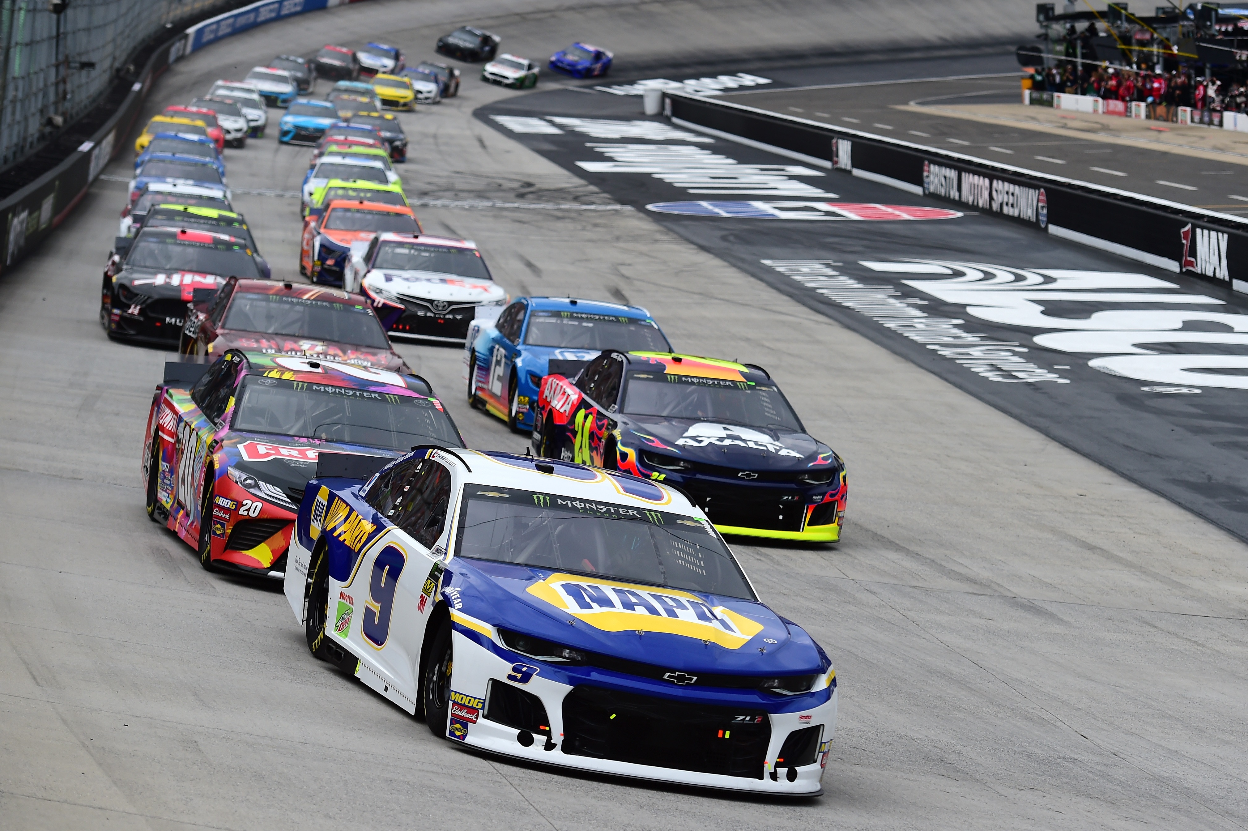 BRISTOL, TN – APRIL 07: Chase Elliott, driver of the #9 NAPA Auto Parts Chevrolet, leads the field into turn one after the start of the Monster Energy NASCAR Cup Series Food City 500 at Bristol Motor Speedway on April 7, 2019 in Bristol, Tennessee. (Photo by Jared C. Tilton/Getty Images)