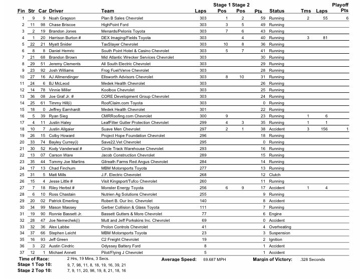 “The team did a great job getting us track position we needed,” Allgaier said after leading a race-high 156 of 303 laps. “I’m more mad at myself for making a mistake and getting off the bottom, but yeah we got wrecked.”