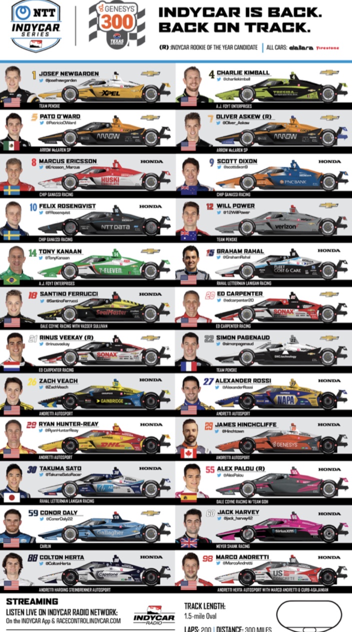So, does Honda’s advantage at Texas stay too? While Newgarden won last year in a Chevrolet powered car, Honda drivers accounted for leading 194 of the 248 completed laps and took four of the top five finishing positions including six of the top eight even. Newgarden, was the only Chevy driver to lead and he did so all at the end. In 2018, Honda led 66-percent of the laps (162 of 248) and took eight of the top nine finishing positions then as well. That’s Honda leading 72-percent of the Texas laps over the last two years. That’s why without any sample size of a race to go by this season, you should side with a Honda driver on Saturday night.