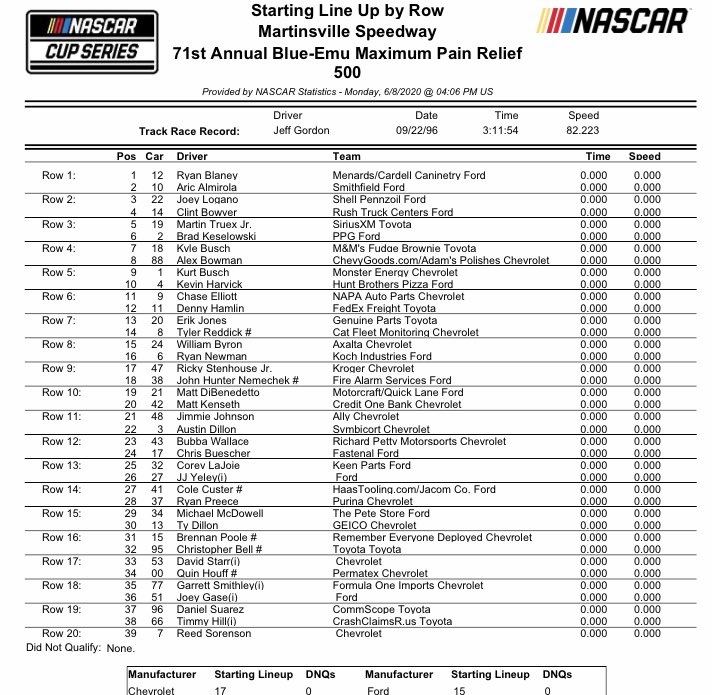 TRACK: Martinsville Speedway (.526-mile Oval) DISTANCE: 500 Laps – STAGE 1/2 (130 Laps each), FINAL STAGE 240 LAPS (263 Miles)