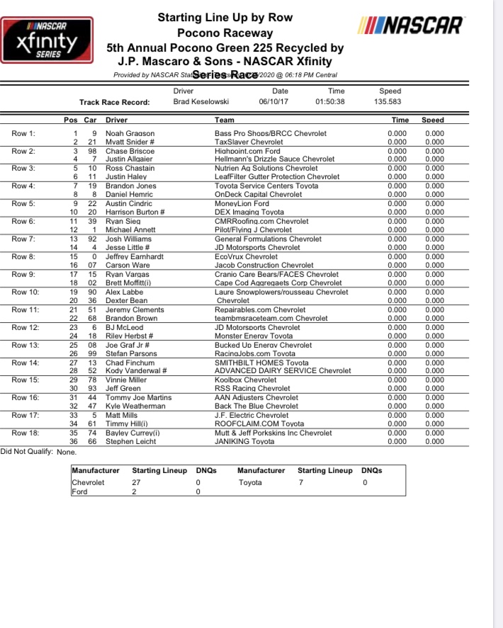 - Alex Labbe (No. 90 DGM Racing Chevrolet) – Labbe has made just one start at Pocono Raceway in the Xfinity Series, finishing 18th in 2018.