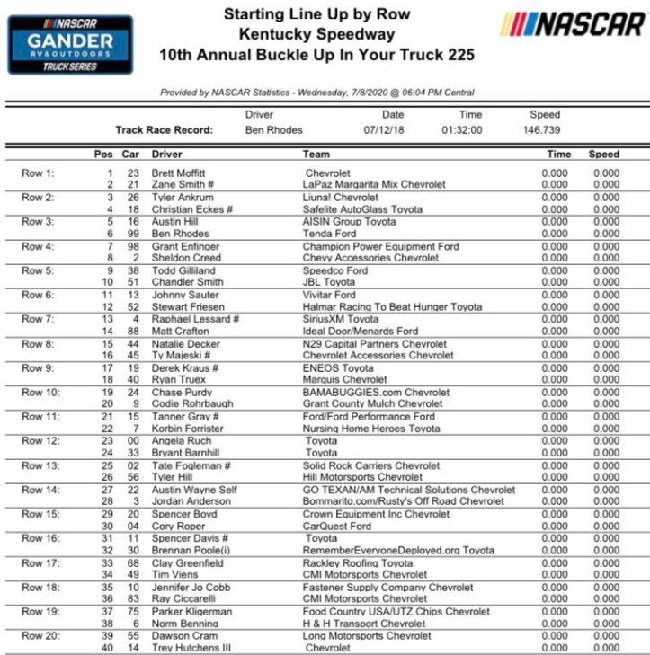 Saturday’s Buckle Up In Your Truck 225 will be 150 laps with Stage 1 ending on Lap 35 and Stage 2 ending on 70.