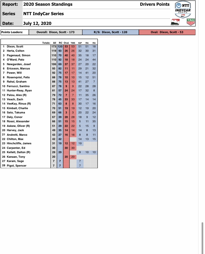 The contact had a ripple effect as Santino Ferrucci, driving the No. 18 SealMaster Honda, made contact with Jack Harvey in the No. 60 AutoNation/SiriusXMHonda. Ferrucci was assessed a penalty for avoidable contact but rebounded to finish sixth. Harvey finished 17th.