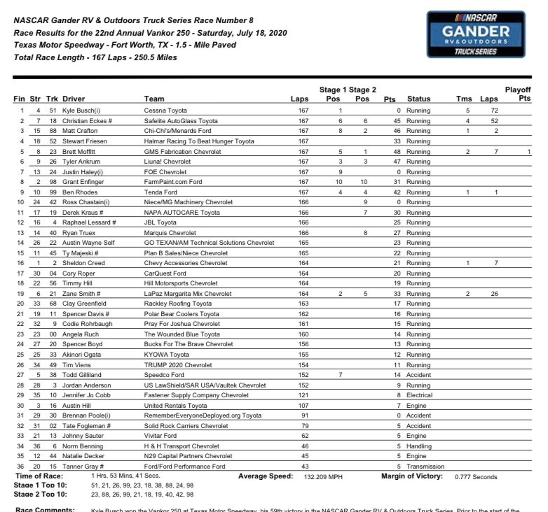 Busch got his 212th career win for Busch in NASCAR’s top three series, one that he thought he had earlier in the Xfinity race. Busch got his 59th career win in 155 Trucks Series starts. He still has 97 Xfinity wins, to go along with 56 Cup Series wins.