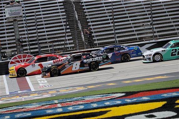 The first caution came five laps into race when Riley Herbst ended up in the wall after coming out of Turn 4 onto the frontstretch with Noah Gragson right behind him. There was significant damage to the rear of the No. 18 Toyota driven by Herbst after it slammed hard into the outside wall, though Gragson said on the radio that his car didn’t make contact. Herbst couldn’t get back up to minimum speed after the restart and his day was over.