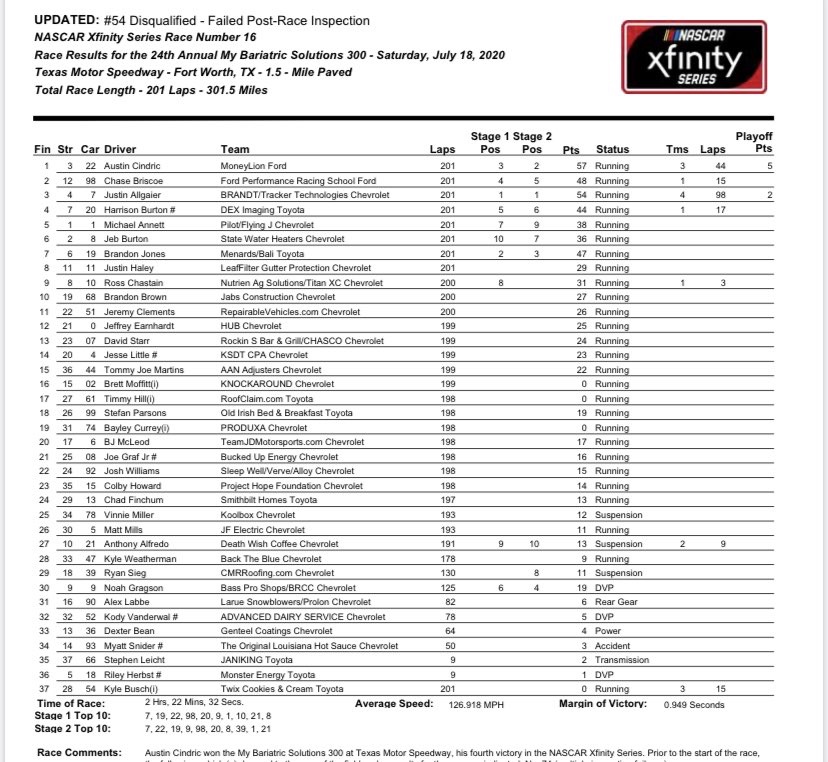 Busch’s car was found out of compliance with the height requirements, according to the NASCAR Rule Book. That ruling elevated Austin Cindric, who was the second driver to take the checkered flag, to his third Xfinity Series victory of the year in the My Bariatric Solutions 300. It also send Busch’s No. 54 to last place in the 37-car field.