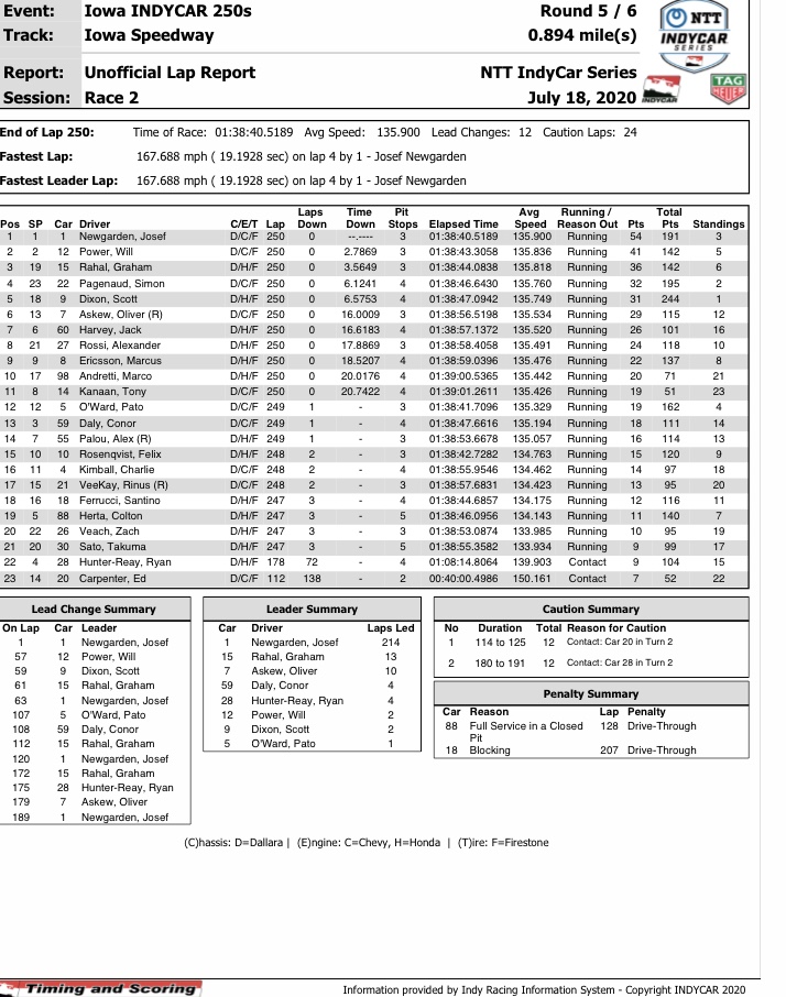 Newgarden, became the first driver to win at Iowa from the pole in a romp of the field on Saturday night. The Tennessee native led 214 laps in total en route to his 15th career NTT IndyCar Series victory. It was the third race in the last four tries at Iowa and fourth time in the last six years that he led 200 or more laps in a race there.