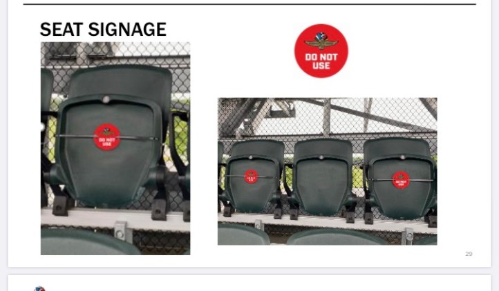 All grandstand seating sections will be open on Indy 500 race day and approximately 25% of the spectator grandstand seats will be used by customers. Red stickers will be placed on each seat that is not available for use. Seats will be assigned so guests will have an empty seat on at least one side and no one sitting directly in front or behind each spectator. Masks are required throughout the venue, including in the grandstands.