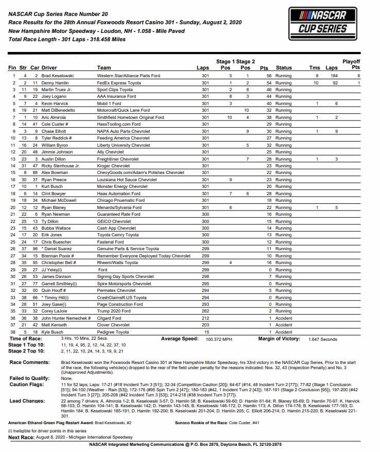 Keselowski, went out and dominated Sunday’s Foxwoods Resort Casino 301 at the. New Hampshire Motor Speedway. He passed Denny Hamlin for the lead on Lap 220 and would never look back in leading the final 81 laps en route to his third victory of the season in his No. 2 Ford.