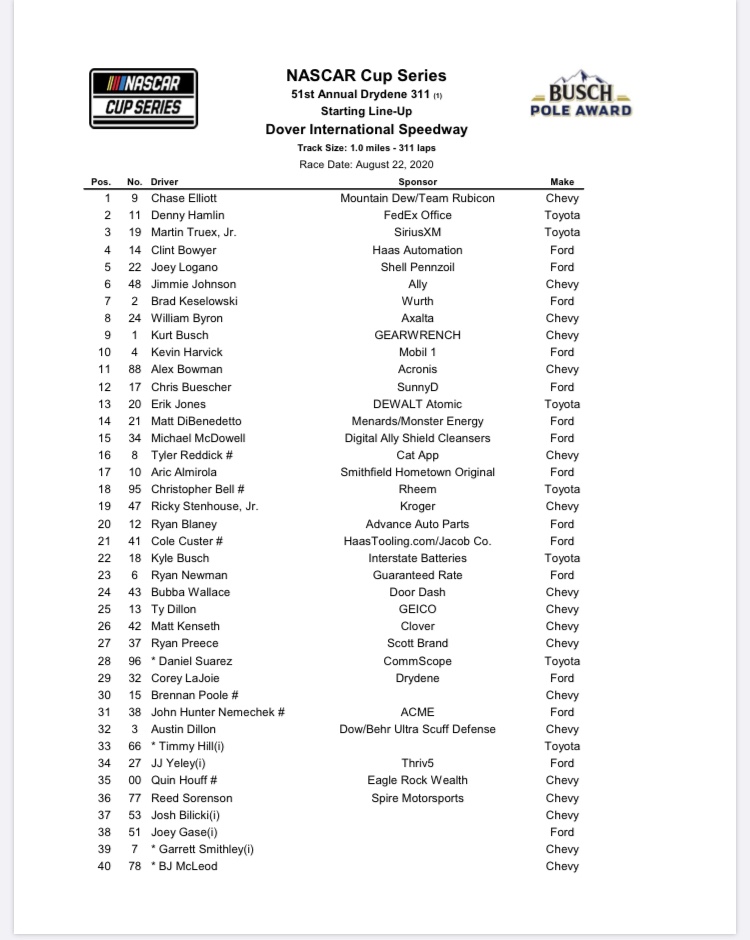 The lineup was determined using NASCAR’s new competition-based formula, which takes into account finishing position from the previous race (weighted 50%), ranking in team owner points (35%) and the fastest lap from the previous race (15%).