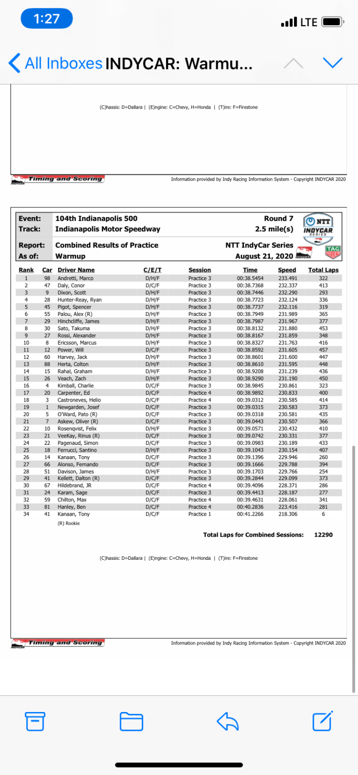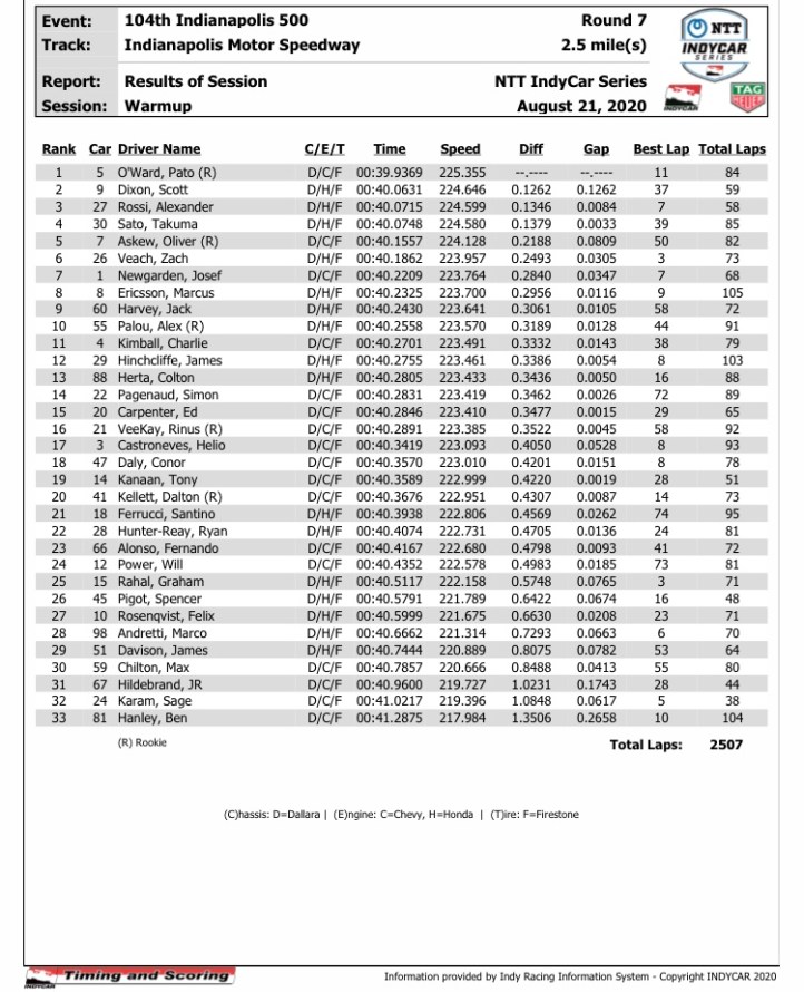 O’Ward, circled the track with a top speed of 225.355 mph in his No. 5 Chevrolet to top all 33 drivers over the 120 minute session in length. O’Ward, was only 28th and 20th on the speed charts in race practice last week but was eighth on Sunday. He starts on the Outside of Row 5 this weekend.