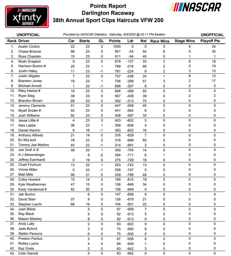 Just before that, race leader at the time Chase Briscoe spun out in turn one, just about ending his chances to sweep both the Xfinity Series events at Darlington Raceway.