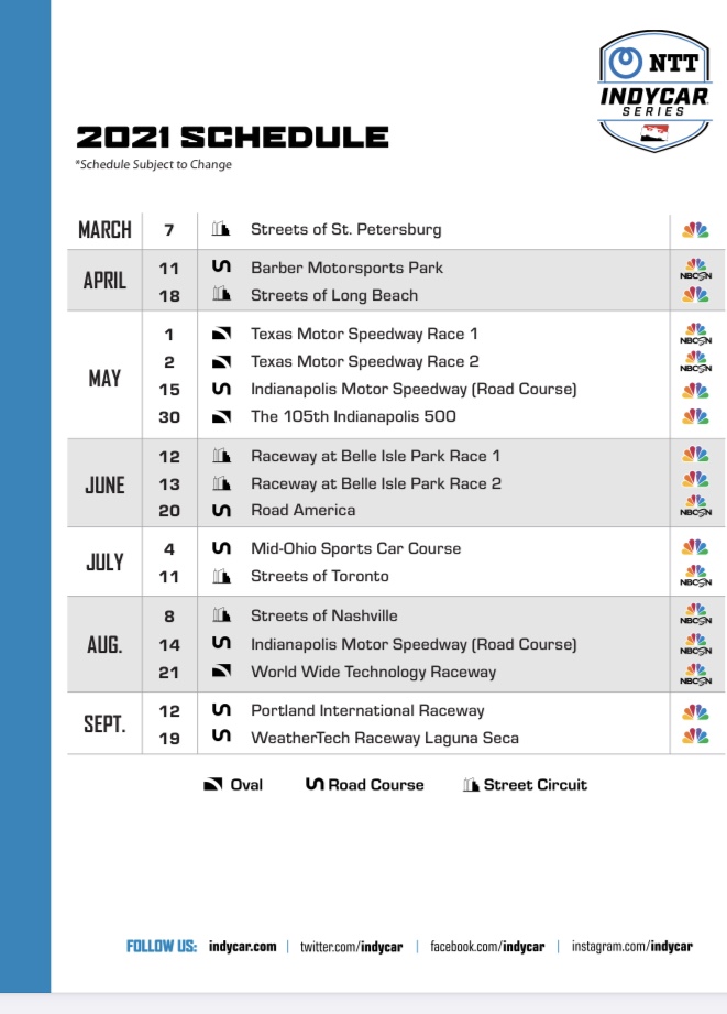INDYCAR officials announced a 17-race schedule for the 2021 NTT INDYCAR SERIES, including expanded network TV coverage, two thrilling high-speed races at Texas Motor Speedway prior to the Indianapolis 500 and a return to its other pillar events.