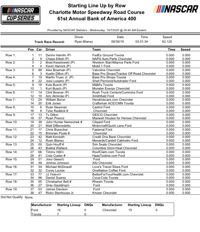 The lineup was determined using NASCAR’s competition-based formula, which is a total number based on the previous event: 15% of a fastest lap time position, 25% of the driver’s final race finish position, 25% of the owner’s final race position and 35% of the owner points position.