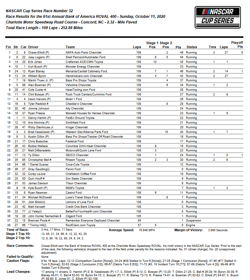 Chase Elliott took the lead from Erik Jones on Lap 92 and never looked back and collected back-to-back Bank of America ROVAL 400 victories Sunday at the Charlotte (N.C.) Motor Speedway ROVAL.