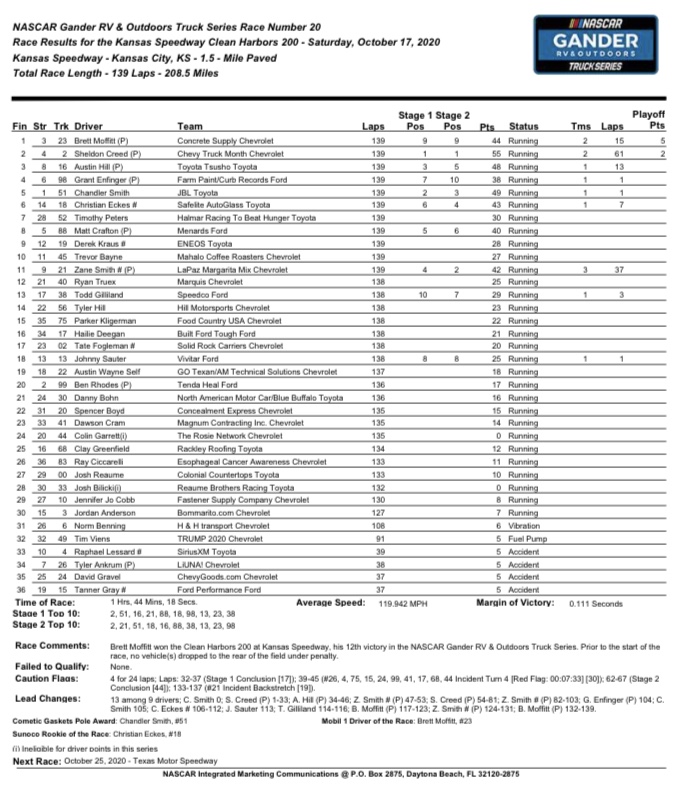On Saturday in Kansas, Lessard crashed early in Turn 4. Eckes finished sixth and fourth respectively in the two stages while Chandler Smith started on the pole and came home second and third in the two stages himself.