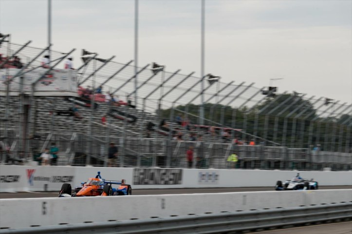 But it wasn’t smooth sailing for Dixon. Sato, the defending winner at WWTR, merged back onto the 1.25-mile oval in third and started charging in his “no attack, no chance” style. Sato made a daring, outside pass of O’Ward for second in Turn 1 with 16 laps to go as he chased down Dixon. Sato quickly caught the “Ice Man,” with the gap to the bright orange-and-blue machine getting as low as three tenths of a second in the closing laps. But Sato was unable to challenge Dixon for the top spot.