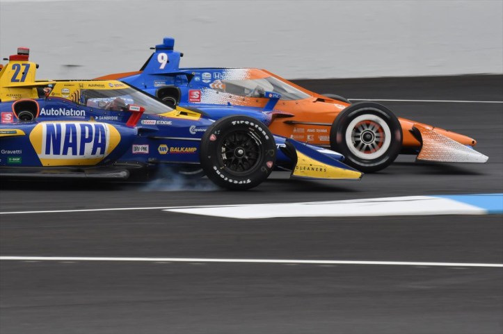 Sato and Dixon were locked in a stirring duel and had just started their 196th lap when Pigot crashed hard in Turn 4, spinning and making contact with the SAFER Barrier on the outside and then slamming into the protective tire barrier at the head of the pit wall with the side of his No. 45 Hy-Vee/Embrace Pittsburgh Honda. The gap between Sato and Dixon rarely exceeded one second and was as close as three-tenths of a second after Sato inherited the lead on Lap 185 when Zach Veach pitted in the No. 26 Gainbridge Honda. Sato appeared to be home free on Lap 191, building a lead of .9515 of a second. But he was approaching the cars of A.J. Foyt Racing teammates Tony Kanaan and Charlie Kimball, which let Dixon close the gap. On Lap 195, Sato cleared 2013 Indy 500 winner Kanaan while Dixon and Rahal remained behind the Brazilian. That expanded Sato’s gap to 1.173 seconds, but Dixon and Rahal lapped Kanaan just before Turn 1 on Lap 196, moments before Pigot’s race-ending crash.