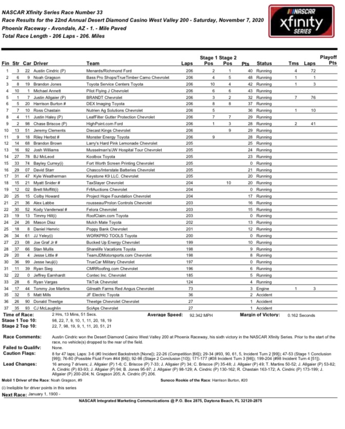 Gragson, started off 2020 with a win at Daytona and had 25 top 10’s in 33 starts. He’s certainly going to be a championship factor next season. This was his first top five finish of his NXS career at Phoenix. He finished runner-up in a Truck Series race here in 2018.