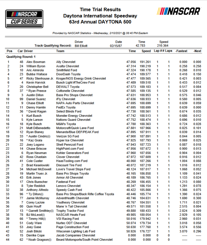 Due to changes to the car between last year and this one, there’s less horsepower. As a result, the pole speed is over 3 mph slower than last year’s set by Stenhouse (194.582 mph). That was the first with the tapered spacer. Byron went 194.305 mph in the final year of the restrictor plate in 2019. It’s been 194 mph or above in eight of the last nine years before these Speedweeks with the only exception being in 2017 when Elliott went 192.872 mph and now Bowman at 191.261 mph. It’s been in the 190’s or above in 10 straight years now though and 11 of the last 12 at that. Jeff Gordon went 201.293 mph in 2015 for the only time 1987 that the pole speed broke the 200 mph barrier.