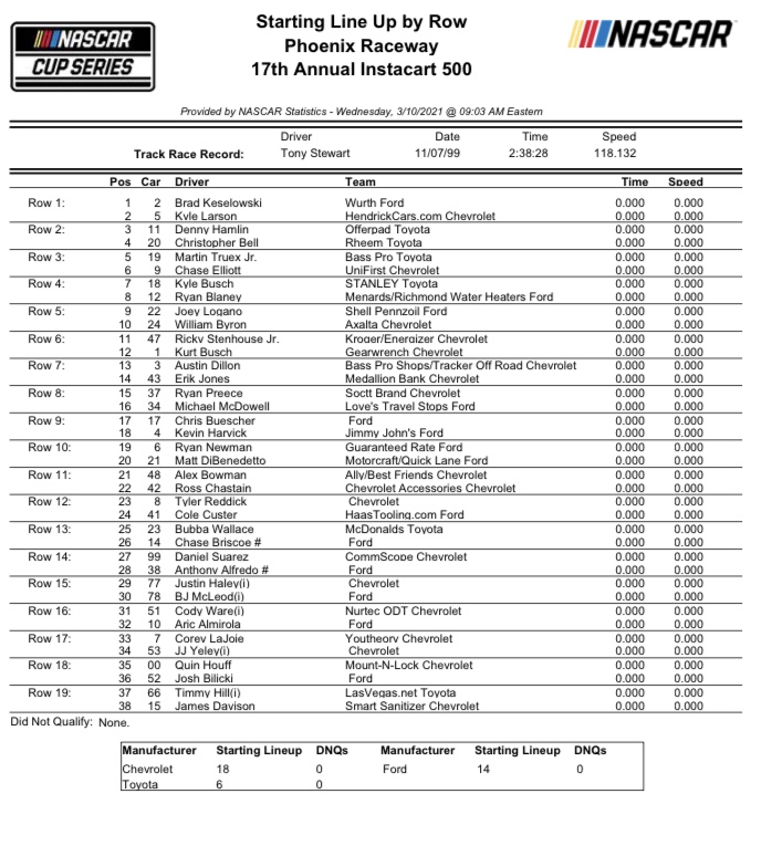TRACK: Phoenix Raceway (1 mile oval) DISTANCE: 312 Laps – STAGE 1: 75 Laps, Stage 2: 115 Laps, FINAL STAGE 122 LAPS, 312 Miles)