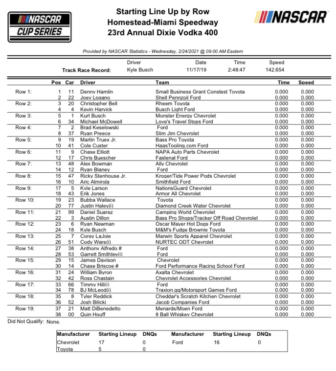 TRACK: Homestead-Miami Speedway (1.5-mile oval) DISTANCE: 267 Laps – STAGE 1: 80 Laps, Stage 2: 80 Laps, FINAL STAGE 107 LAPS, 400.5 Miles)