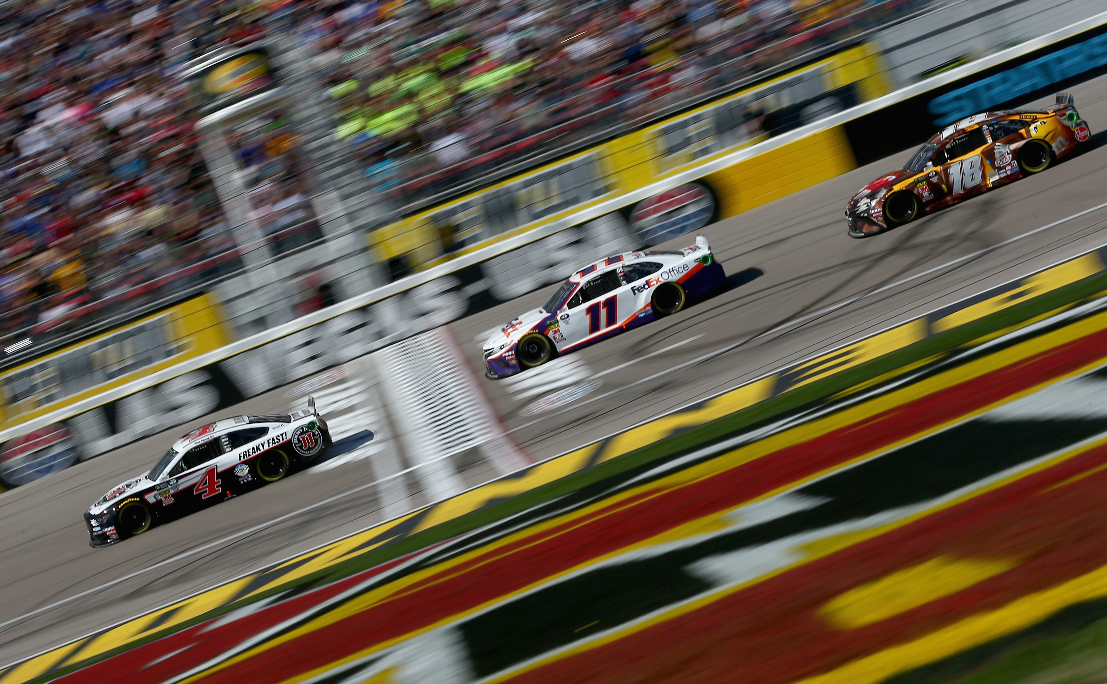LAS VEGAS, NV – MARCH 03: Kevin Harvick, driver of the #4 Jimmy John’s Ford, and Denny Hamlin, driver of the #11 FedEx Office Toyota, lead the field to green for the start of the Monster Energy NASCAR Cup Series Pennzoil Oil 400 at Las Vegas Motor Speedway on March 3, 2019 in Las Vegas, Nevada. (Photo by Sarah Crabill/Getty Images)
