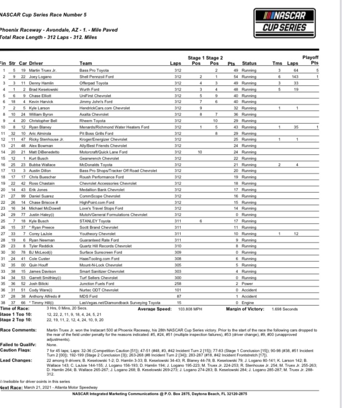 Truex, faded to 17th in Stage 1 and they came around during the second stage. He came all the way up to finish second. He’d in fact take over the lead on Lap 223 and lead all but 25 laps the rest of the way en route to his 28th career Cup Series victory including his first in 31 starts at Phoenix.