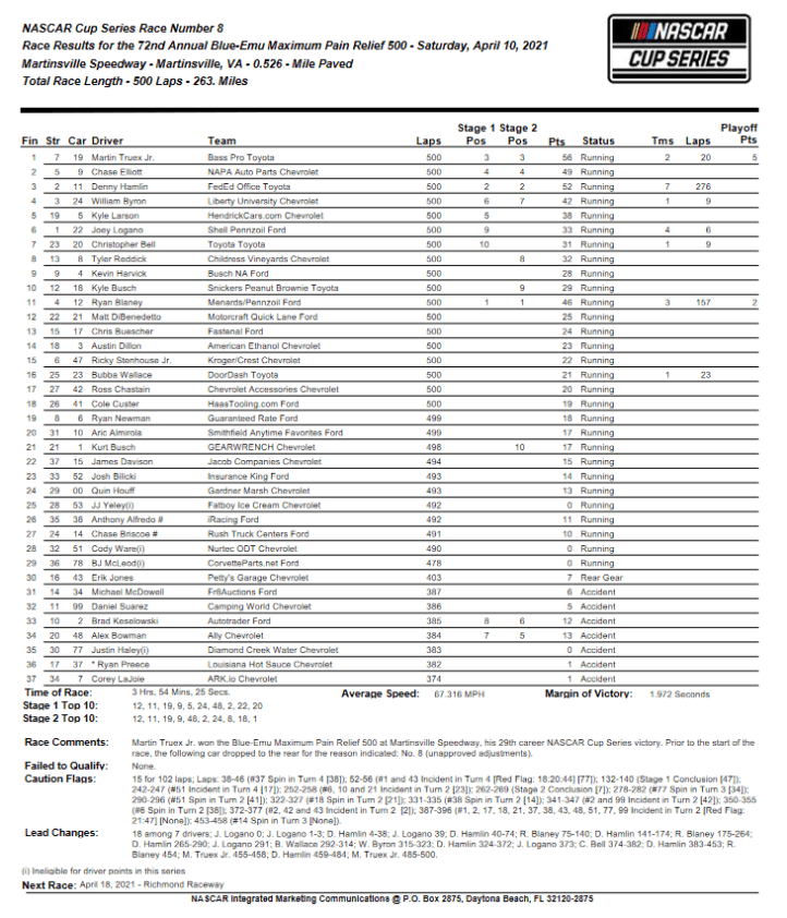 Denny Hamlin didn’t have good long run pace. Ryan Blaney had a bad final pit stop which got him penalized and as a result took him out of contention of winning Sunday’s rain delayed NASCAR Cup Series race at the Martinsville (VA) Speedway. Both opened up the door for Martin Truex Jr. to win the Blue-Emu Maximum Pain Relief 500.