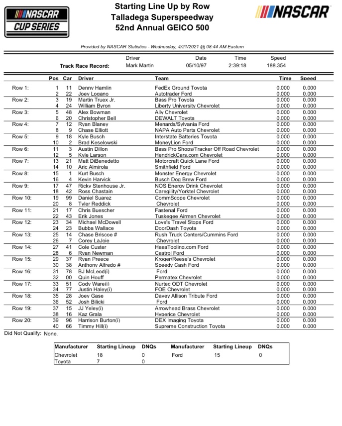 TRACK: Talladega Speedway (2.66-mile oval) DISTANCE: 188 Laps – STAGE 1: 60 Laps, Stage 2: 60 Laps, FINAL STAGE 68 LAPS, 500.08 Miles)