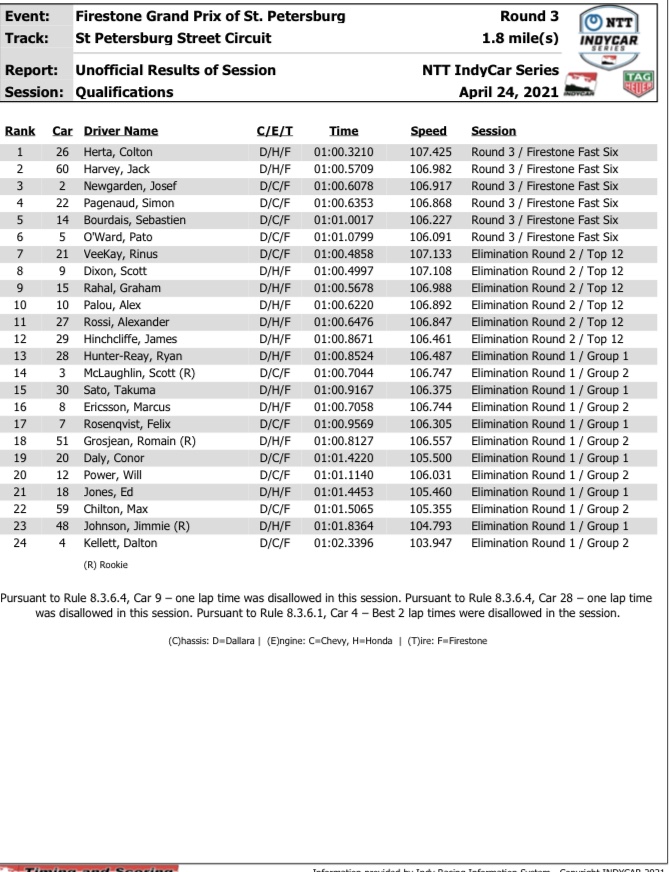 In respect to that, we can eliminate anyone coming from 11th on back. So, lets advance Colton Herta, Jack Harvey, Josef Newgarden, Simon Pagenaud, Sebastien Bourdais, Pato O’Ward, Rinus VeeKay, Scott Dixon, Graham Rahal and Alex Palou.