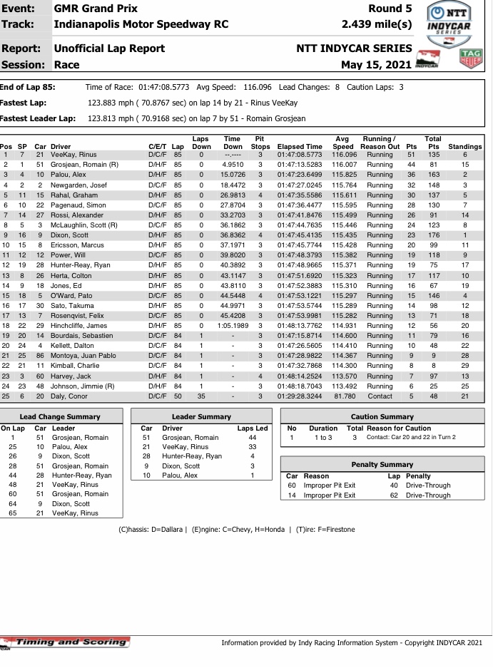 Grosjean, would lead a race-high 44 of 85 laps en route to his first career podium in his No. 51 Honda. Alex Palou was third in his No. 10 Honda for his third podium in 19 career series starts, two of which coming this season.