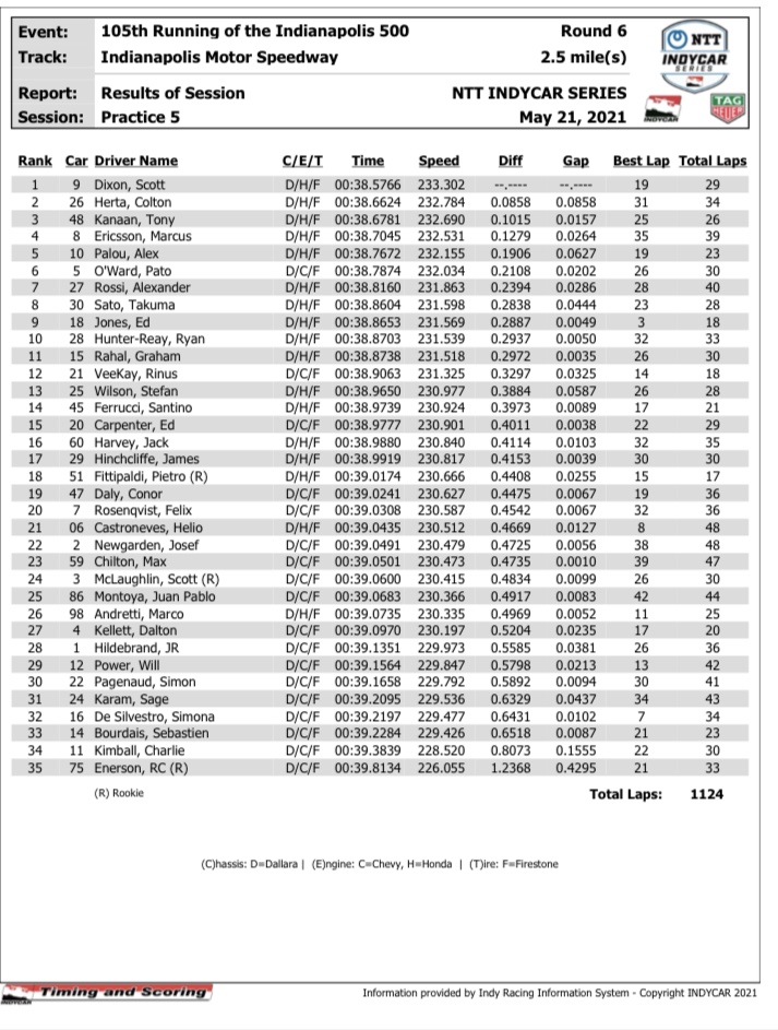 So, it was surprising to see them quicker on Fast Friday. They had three cars in the top 10 on the overall speed chart but most impressively, 1st (Rossi) and 6th (Herta) on the no tow and 2nd (Herta), 4th (Rossi) and 5th (Wilson) on the 4 lap averages.