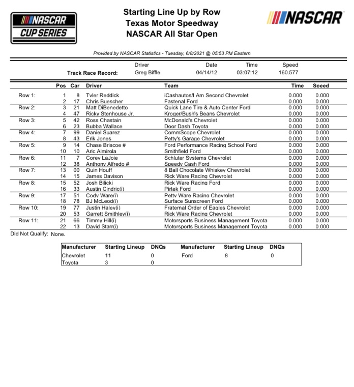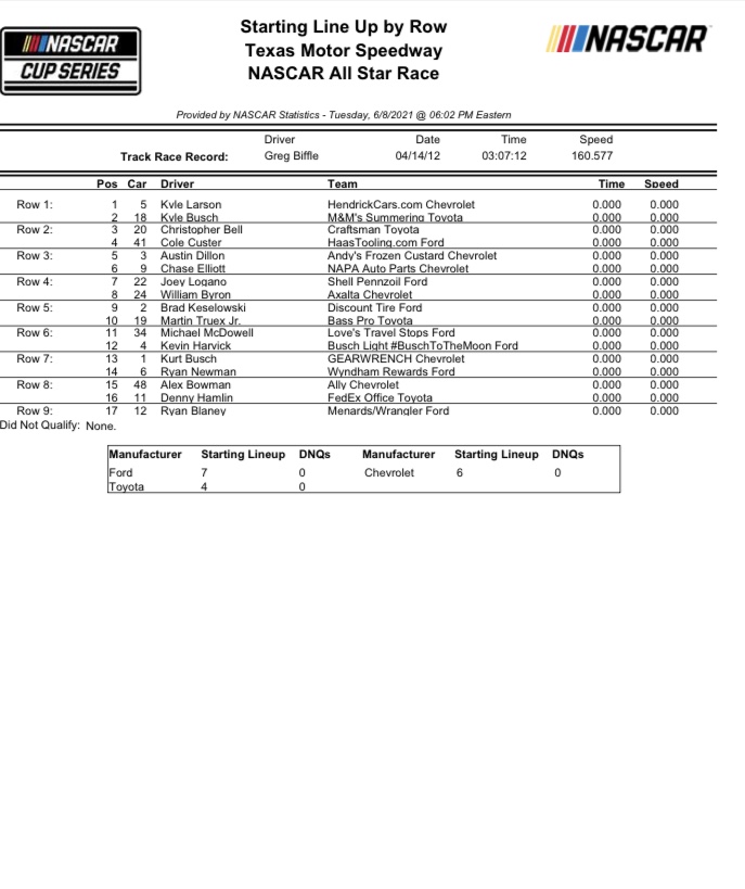 Larson, who has won the last two NASCAR Cup Series races, will start his No. 5 Hendrick Motorsports Chevrolet from the pole position. Larson is one of three drivers with multiple wins in 2021, joining Joe Gibbs Racing’s Martin Truex Jr. and teammate Alex Bowman. The 2019 NASCAR All-Star Race winner will start on the front row alongside Kyle Busch’s No. 18 Joe Gibbs Racing Toyota.