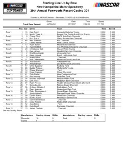 TRACK: New Hampshire Motor Speedway (1.058-mile oval). DISTANCE: 301 Laps — STAGE 1: 75 Laps, STAGE 2: 110 Laps, FINAL STAGE: 116 Laps, MILES (318.458 Miles)