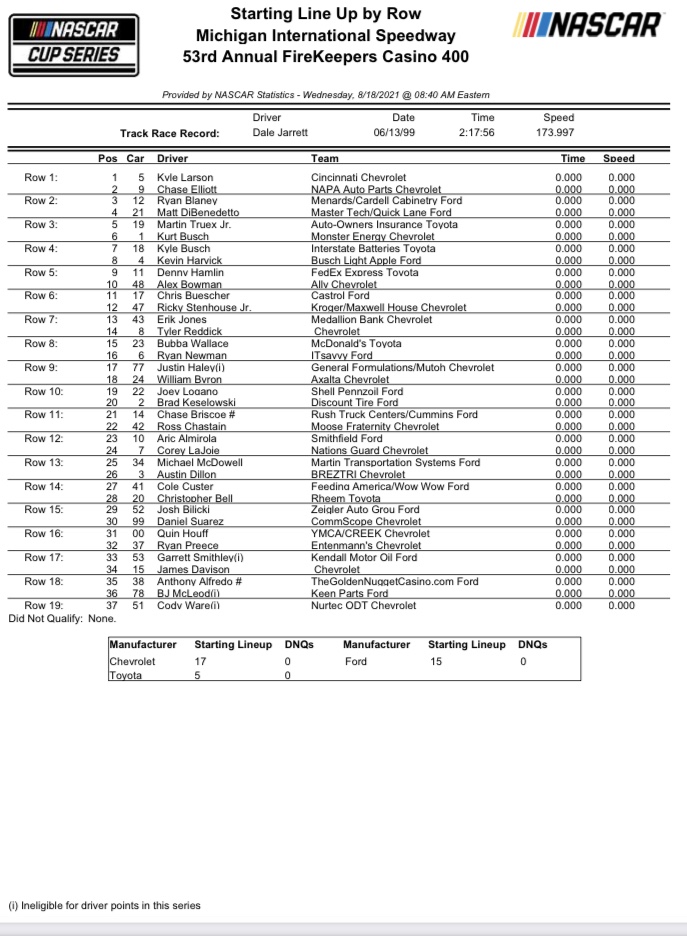 TRACK: Michigan International Speedway (2 mile oval) DISTANCE: 200 Laps — STAGE 1: 60 Laps, STAGE 2: 60 Laps, FINAL STAGE: 80 Laps, MILES (400 Miles)