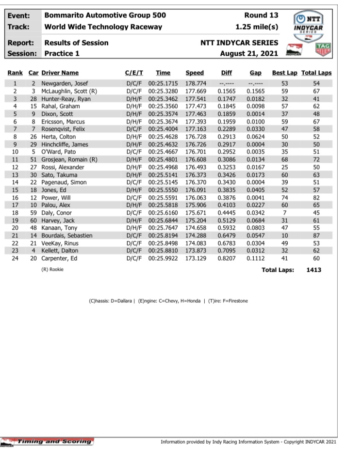 For the 90 minute practice session specifically, don’t pay much attention to the speed charts. Yes, Team Penske went 1-2 with Josef Newgarden topping the session with a speed of 178.774 mph in his No. 2 Chevrolet. His teammate Scott McLaughlin was P2 at 177.669 mph. The reason though on why I feel like that session’s timing chart was irrelevant is because conditions during practice are going to be much different than the conditions later in the race.