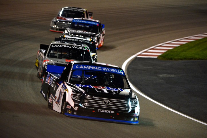 MADISON, Ill — Friday night’s Toyota 200 was a survival of the fittest among the NASCAR Camping World Truck Series drivers. Not only did they have to endure a near 50 minute red flag period for when the power went out at the World Wide Technology Raceway shortly after the second stage began, but they also had to endure a lot of carnage with over half of the 10 driver playoff field was collected in incidents.