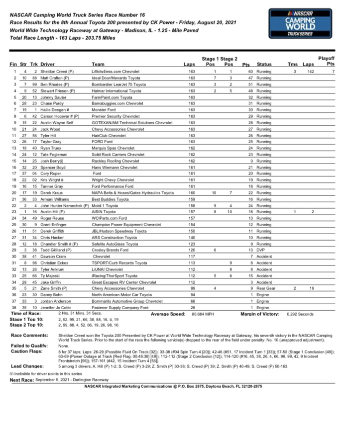 On the flip side, it ended up being a bad night for the championship favorite in Nemechek. He started on the front row but quickly dropped due to a bad handling race car. He was down to 10th really quickly before only being ninth in the first stage. He found his way up to fourth by the end of the second stage before being the culprit of that big crash. While he’d continue on and even get back up to fifth after, he had a mechanical failure and have to go behind the wall to fix before coming back out. Nemechek, had four top two finishes in the six races prior to this one but now slides back to normal after St. Louis.