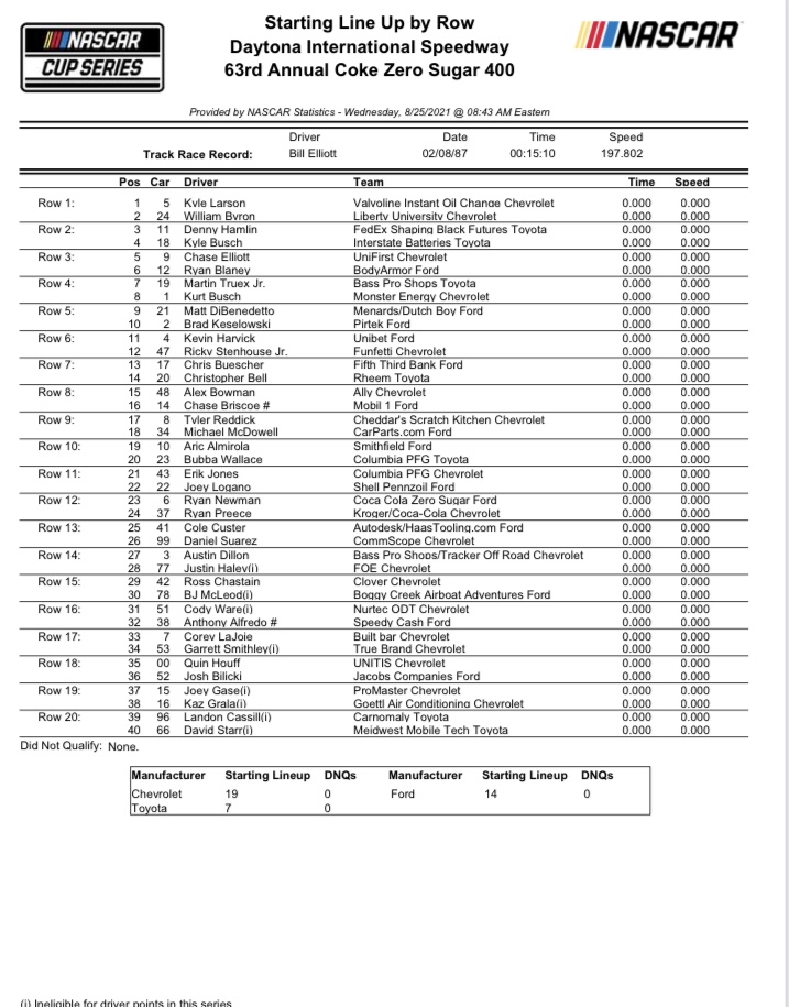 TRACK: Daytona International Speedway (2.5-mile trioval). DISTANCE: 160 Laps — STAGE 1: 50 Laps, STAGE 2: 50 Laps, FINAL STAGE: 60 Laps, MILES (400-Miles)