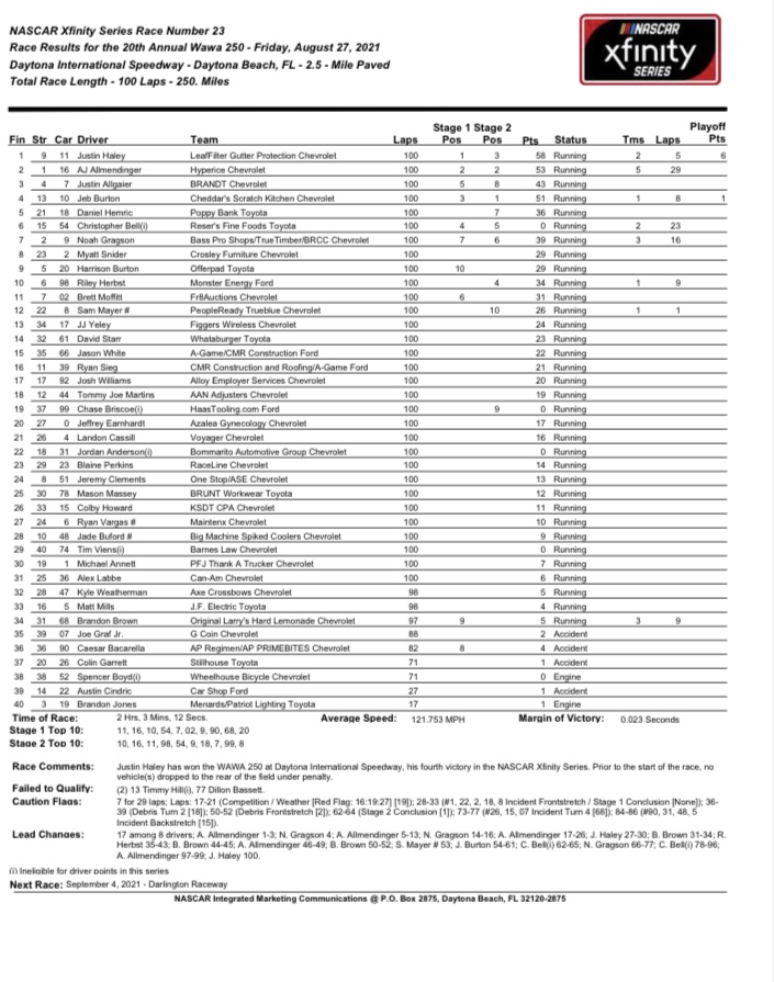 That allowed Haley to use the high line and the momentum to prevail in what was his fifth win of his career in a superspeedway. Three are at Daytona with two of which being in NXS and one in the 2019 Coke Zero Sugar 400.
