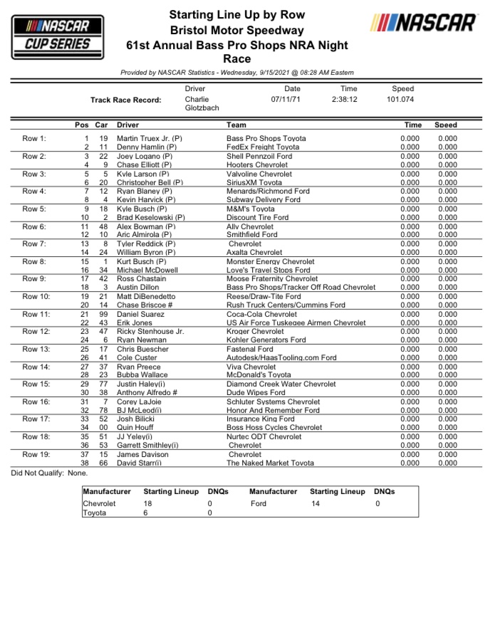 TRACK: Bristol Motor Speedway (.533 mile oval). DISTANCE: 500 Laps — STAGE 1: 125 Laps, STAGE 2: 125 Laps, FINAL STAGE: 250 Laps, MILES (266.5 Miles)