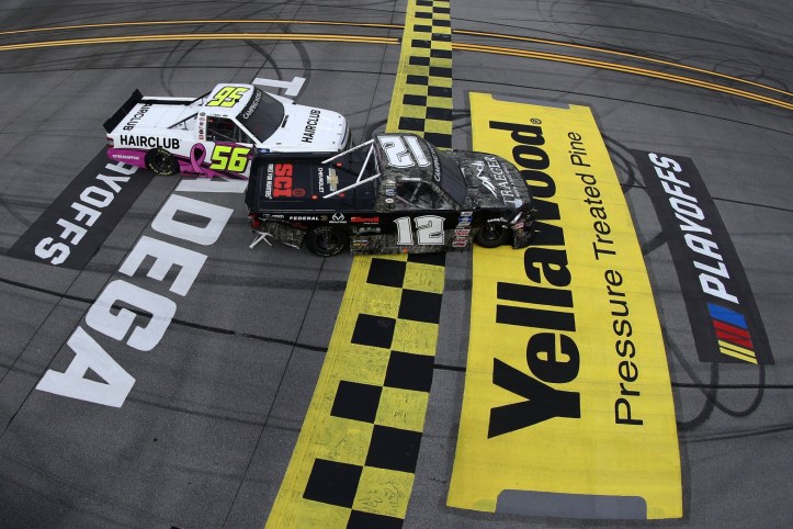 TALLADEGA, Ala — Credit the start/finish line at the Talladega Superspeedway being in the position that it’s in as to why we saw another wilding ending to Saturday’s Chevrolet Silverado 250. See, at most tracks, the finish line is setup in the middle of the tri-oval. At Talladega, it’s in the straightaway between the tri-oval and the first corner. Because of that extra feet of real estate to settle the score, it’s allowed some wild moments coming to the stripe.