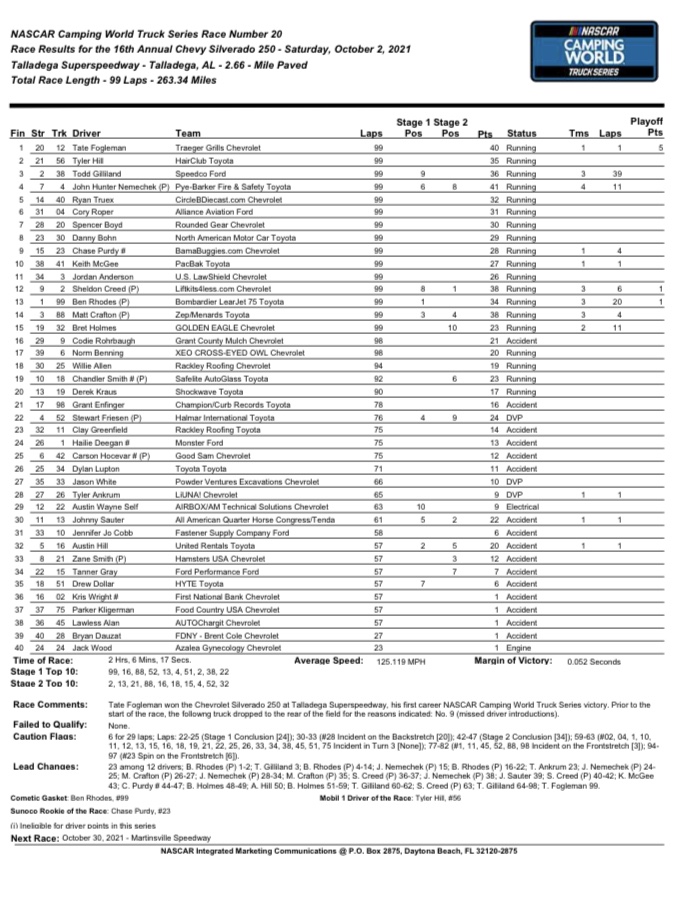For Fogleman, he becomes the fourth straight driver to lead only the final lap of the Truck race at Talladega. The last three were their first career wins.