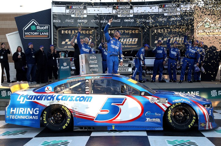 KANSAS CITY, KANSAS – OCTOBER 24: Kyle Larson, driver of the #5 HendrickCars.com Chevrolet, celebrates in the Ruoff Mortgage victory lane after winning the NASCAR Cup Series Hollywood Casino 400 at Kansas Speedway on October 24, 2021 in Kansas City, Kansas. (Photo by Sean Gardner/Getty Images)