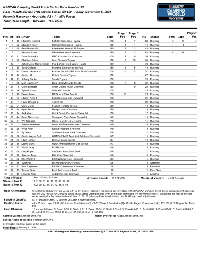 Stewart Friesen brought his No. 52 Toyota home runner-up, crossing the finish line 4.694-seconds behind Smith. Friesen, has five straight top six finishes now at Phoenix and five in the final seven starts to the year. Friesen, was fourth in both stages himself.