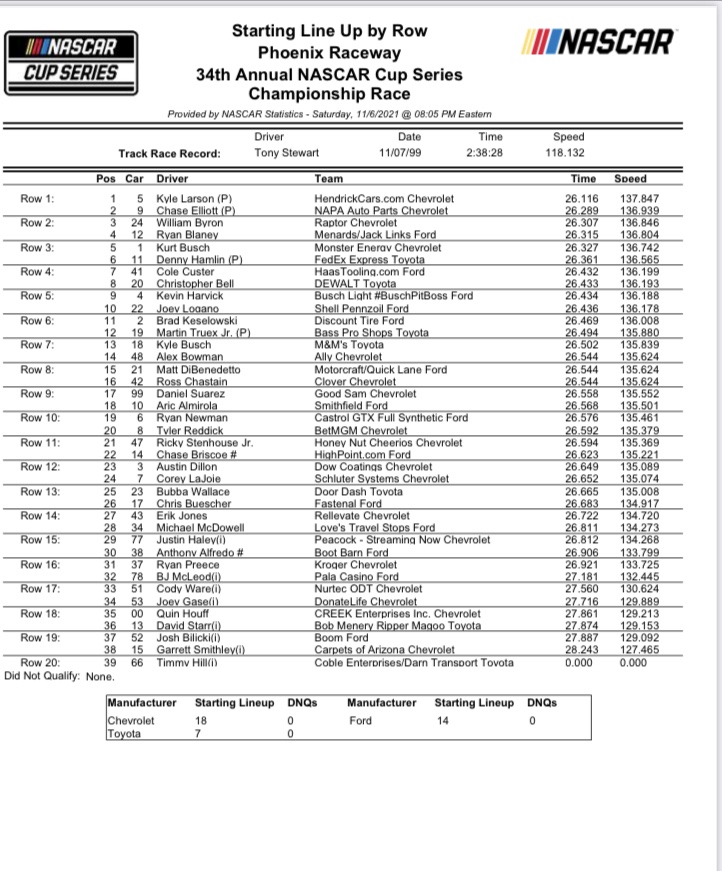 Then came two more qualifiers to close it out. Kyle Larson. Michael McDowell. Larson, on his final lap, bested Elliott with a speed of 137.847 mph in his No. 5 Chevrolet good enough for his 10th Busch Pole Award in 259 career starts. When we’ve qualified this year, outside of Daytona which was set by the Duels and Bristol by heat races, he was second at COTA, first at Charlotte, fifth in Nashville, second at Road America, fourth at Indy and now the pole.