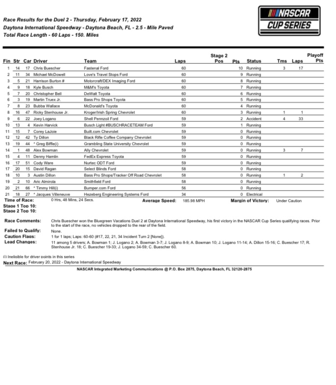 From start to finish, the second Duel went caution free until the final half lap. 48-minutes and 23-seconds later Chris Buescher was celebrating in victory lane.