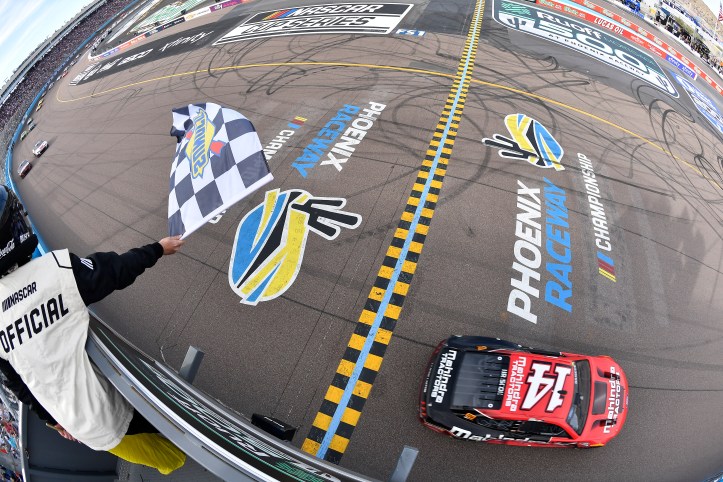 AVONDALE, ARIZONA – MARCH 13: Chase Briscoe, driver of the #14 Mahindra Tractors Ford, crosses the finish line to win the Ruoff Mortgage 500 at Phoenix Raceway on March 13, 2022 in Avondale, Arizona. (Photo by Logan Riely/Getty Images)