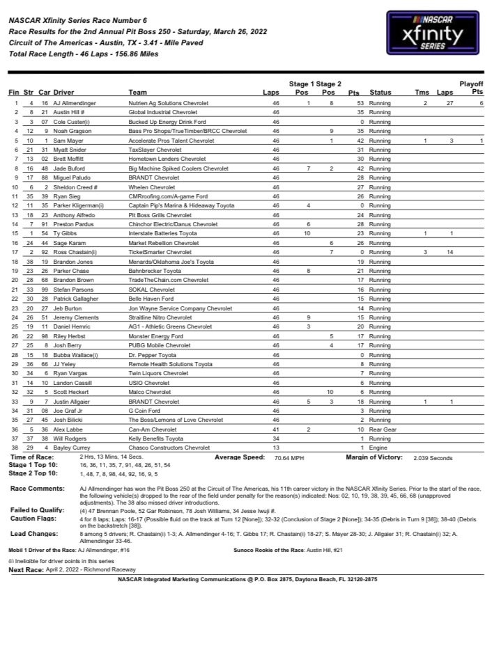 AUSTIN, TX — AJ Allmendinger had been close all season. He was the only driver that had a top 10 finish in literally all five races run during the early portions of the 2022 Xfinity Series slate. The thing was, he only had a pair of top fives to show for it.